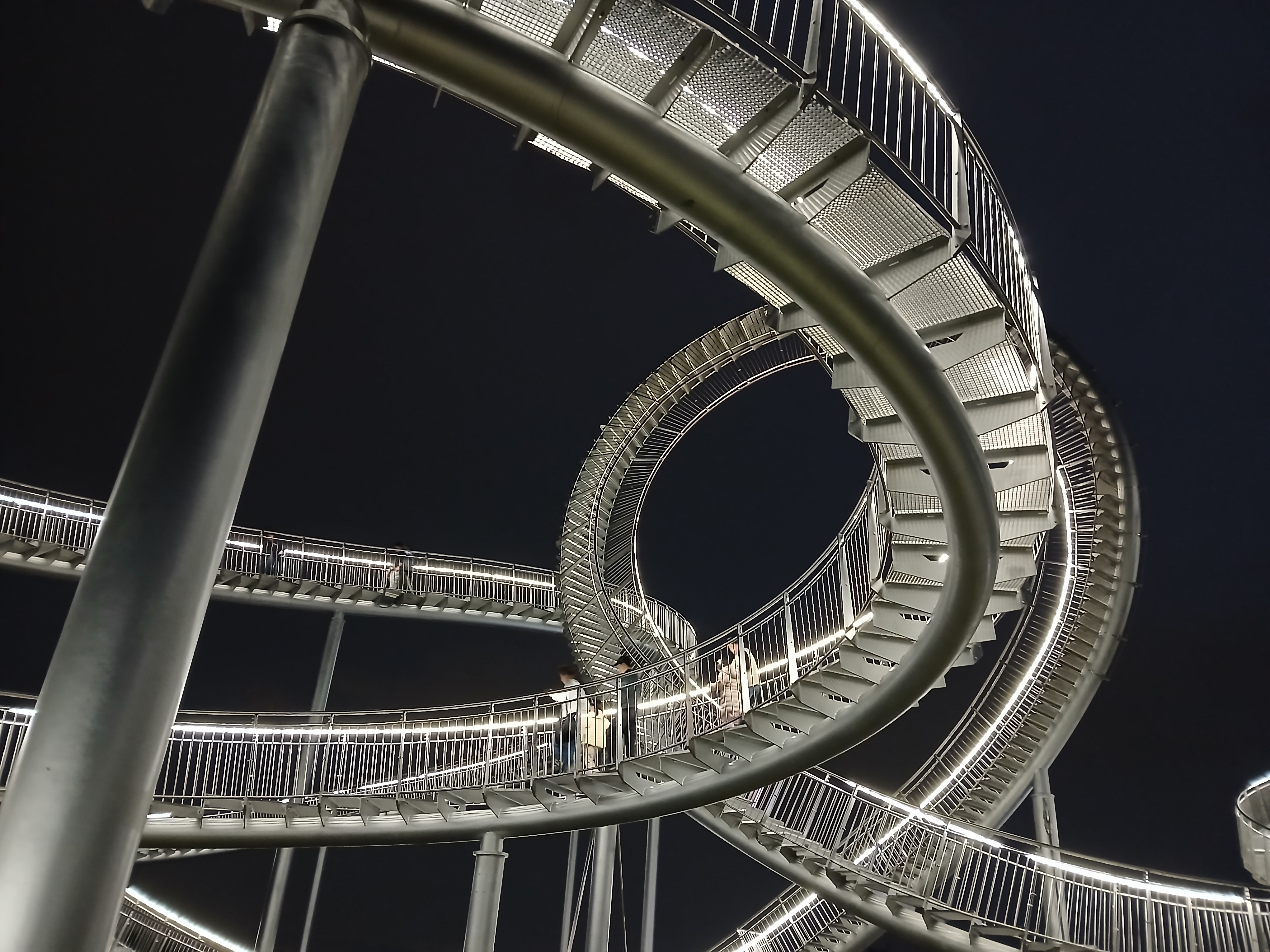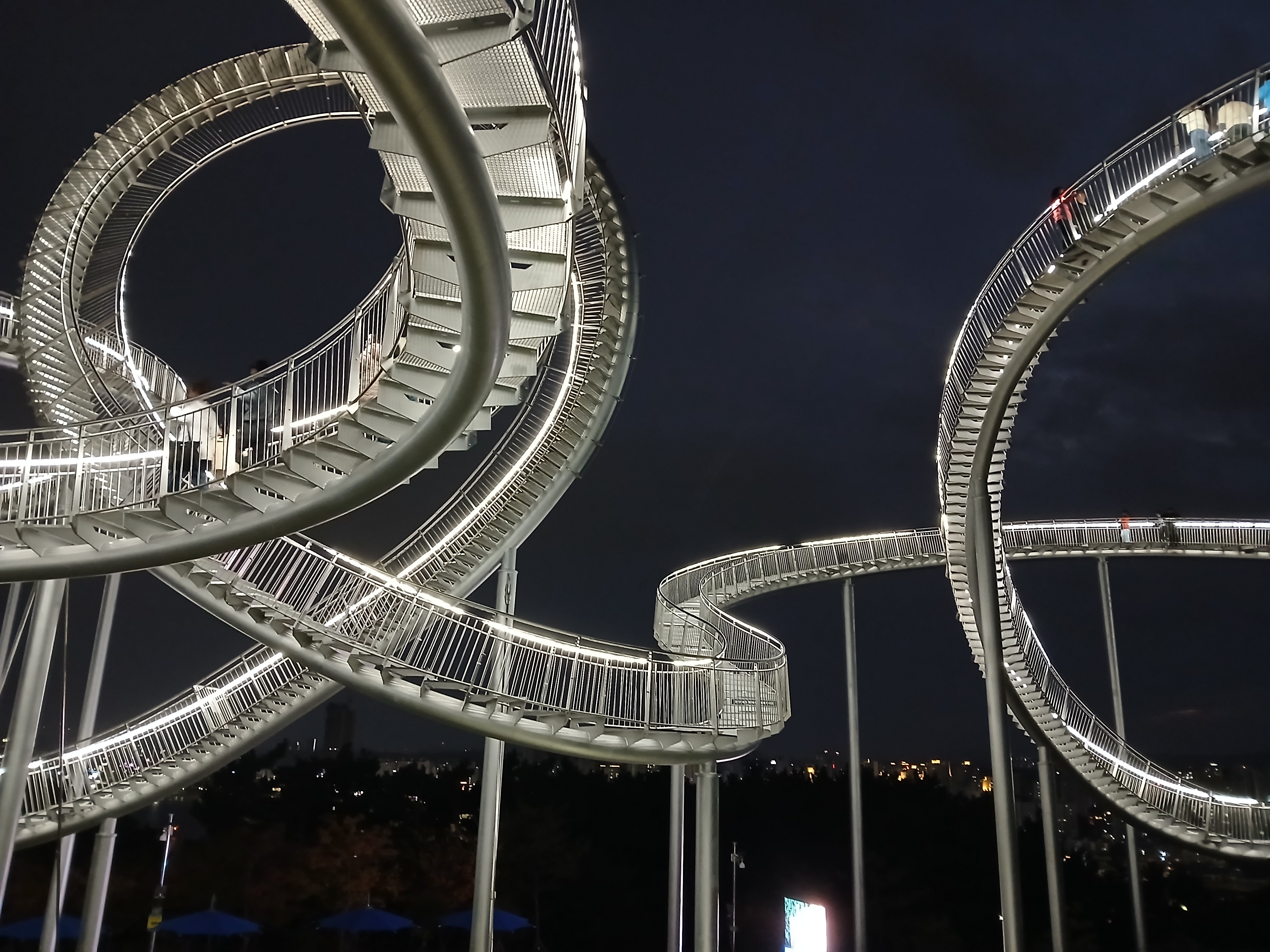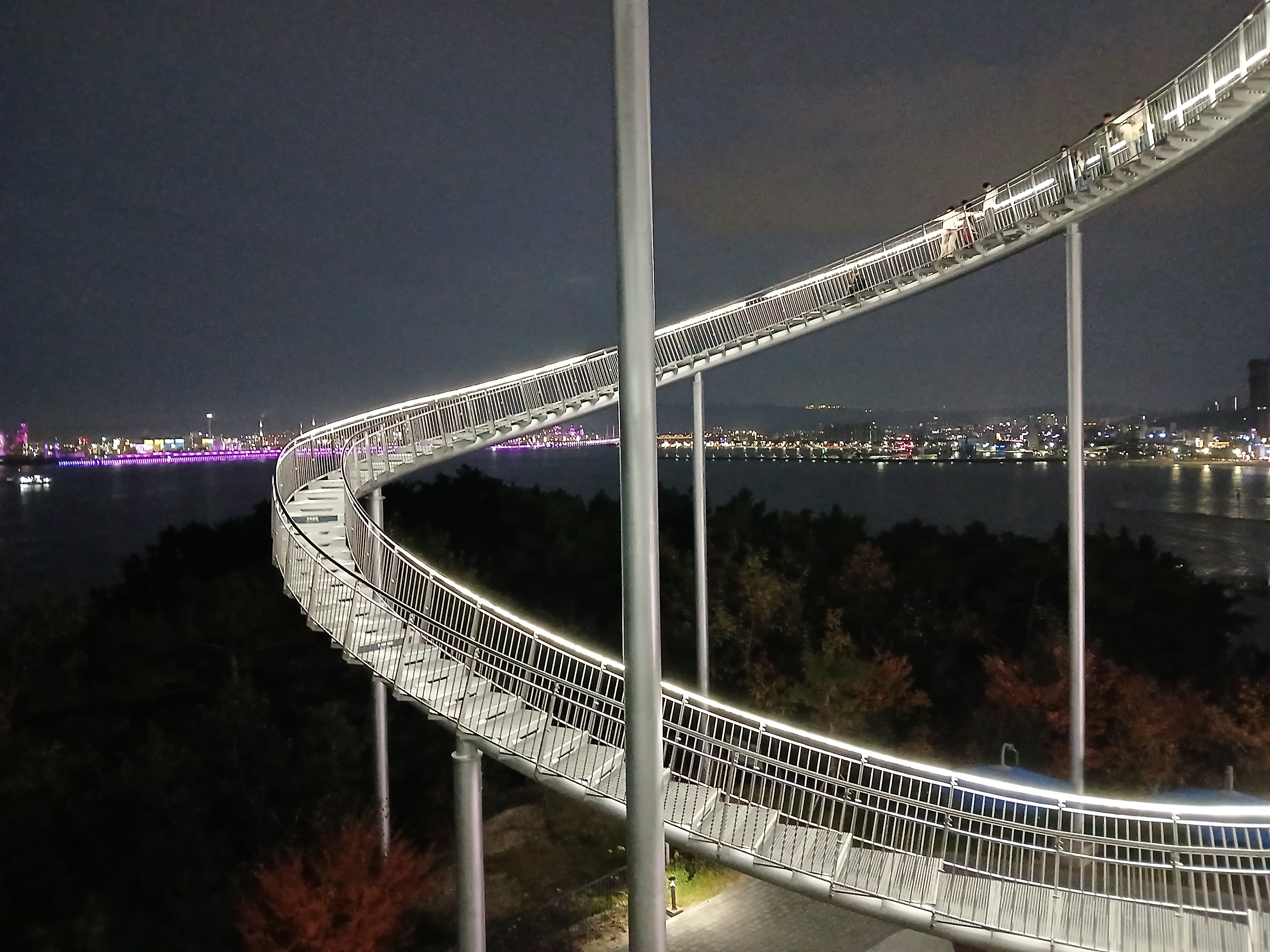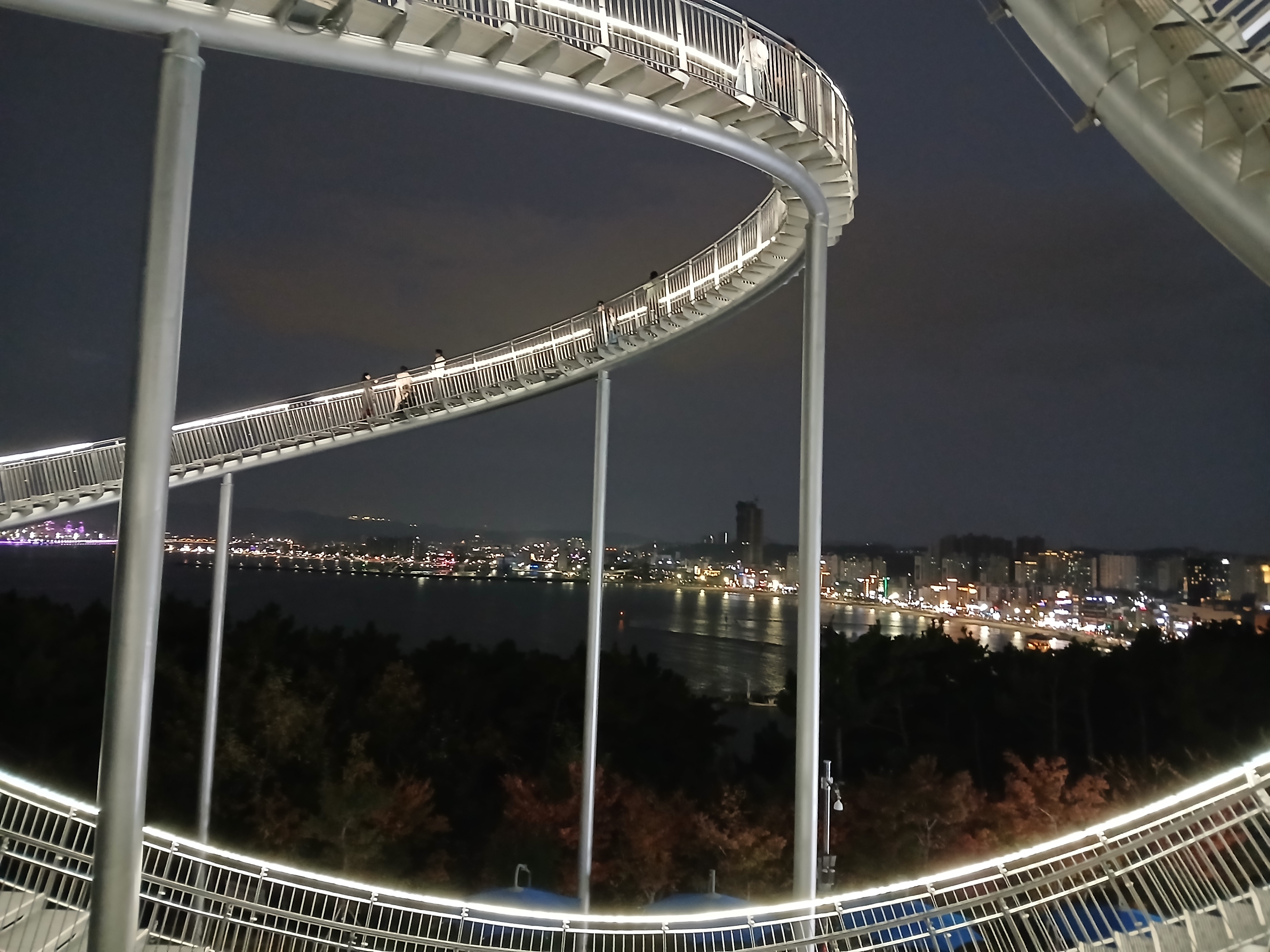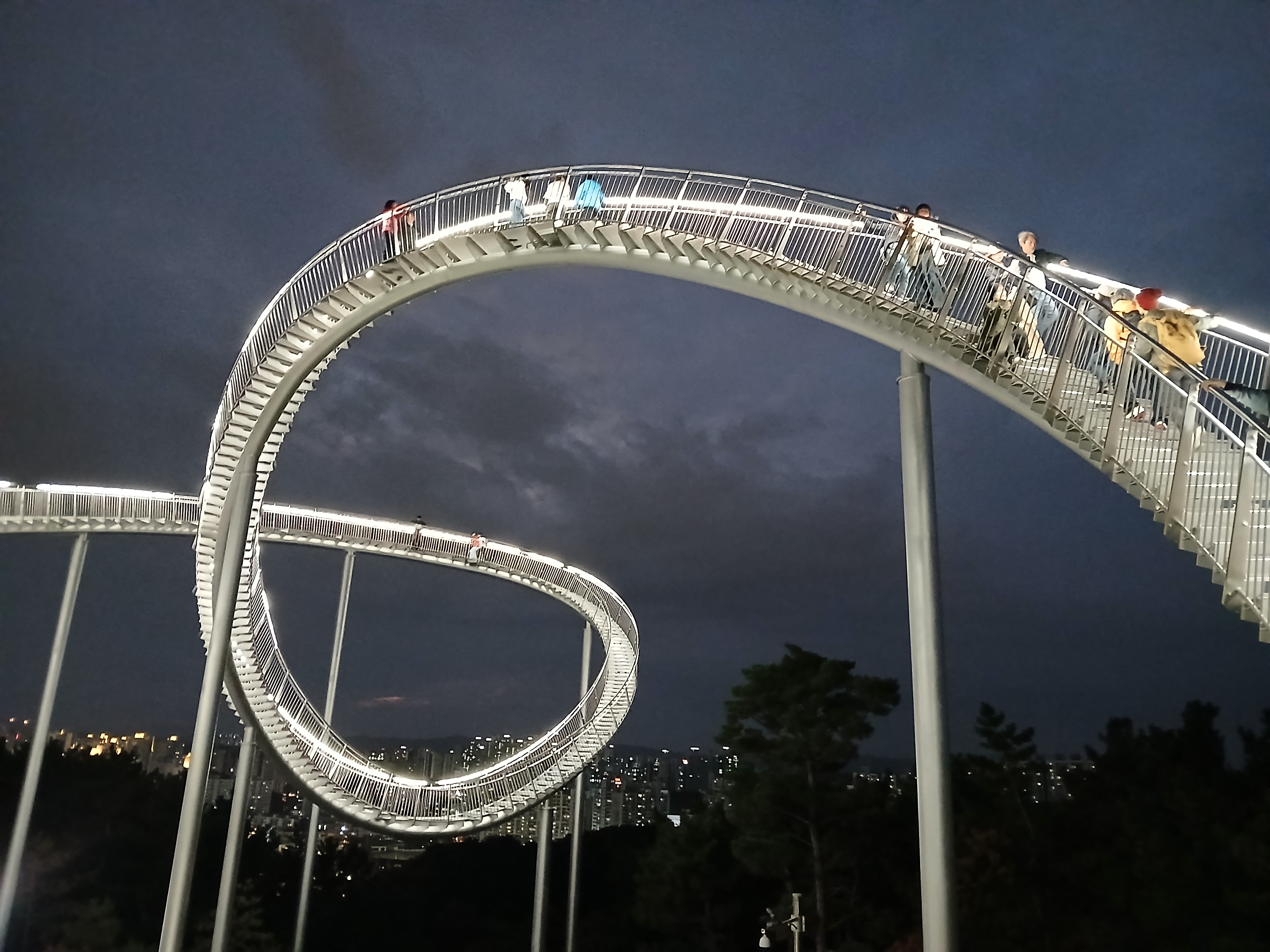 특히 해가 완전히 진 뒤, 용의 꼬리 부분 아래에서 올려다본 모습은 최고의 포토스팟입니다. 반짝이는 곡선과 함께 영일만의 불빛이 어우러져 마치 미래 도시의 한 장면 같아요.