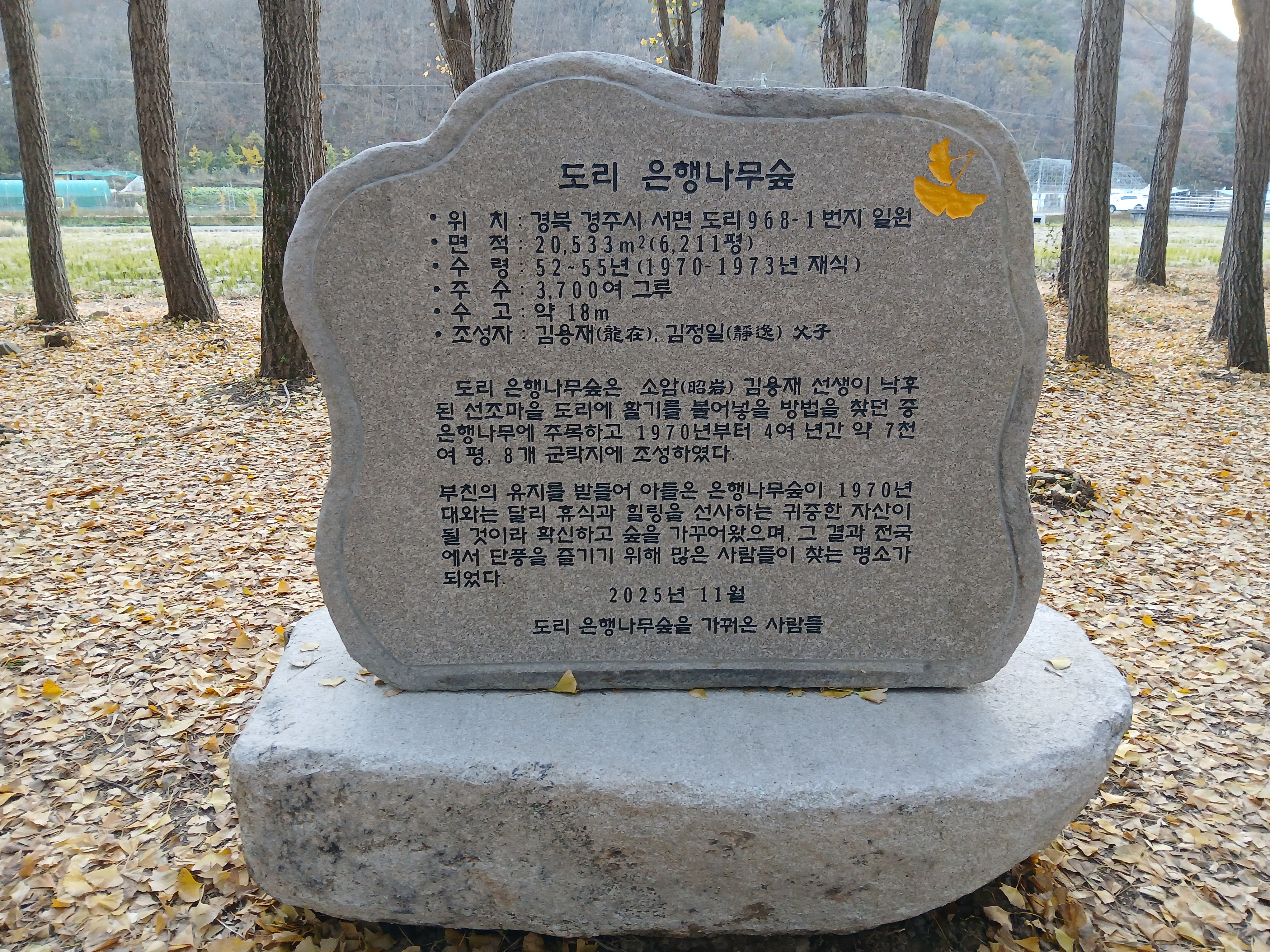 경주시 외곽, 고즈넉한 시골 풍경 사이에 자리한 도리마을 은행나무 숲. 노랗게 물들은 은행잎이 흩날리는 이곳은 가을이면 황금빛으로 타오르는 또 하나의 작은 기적을 만들어낸다.